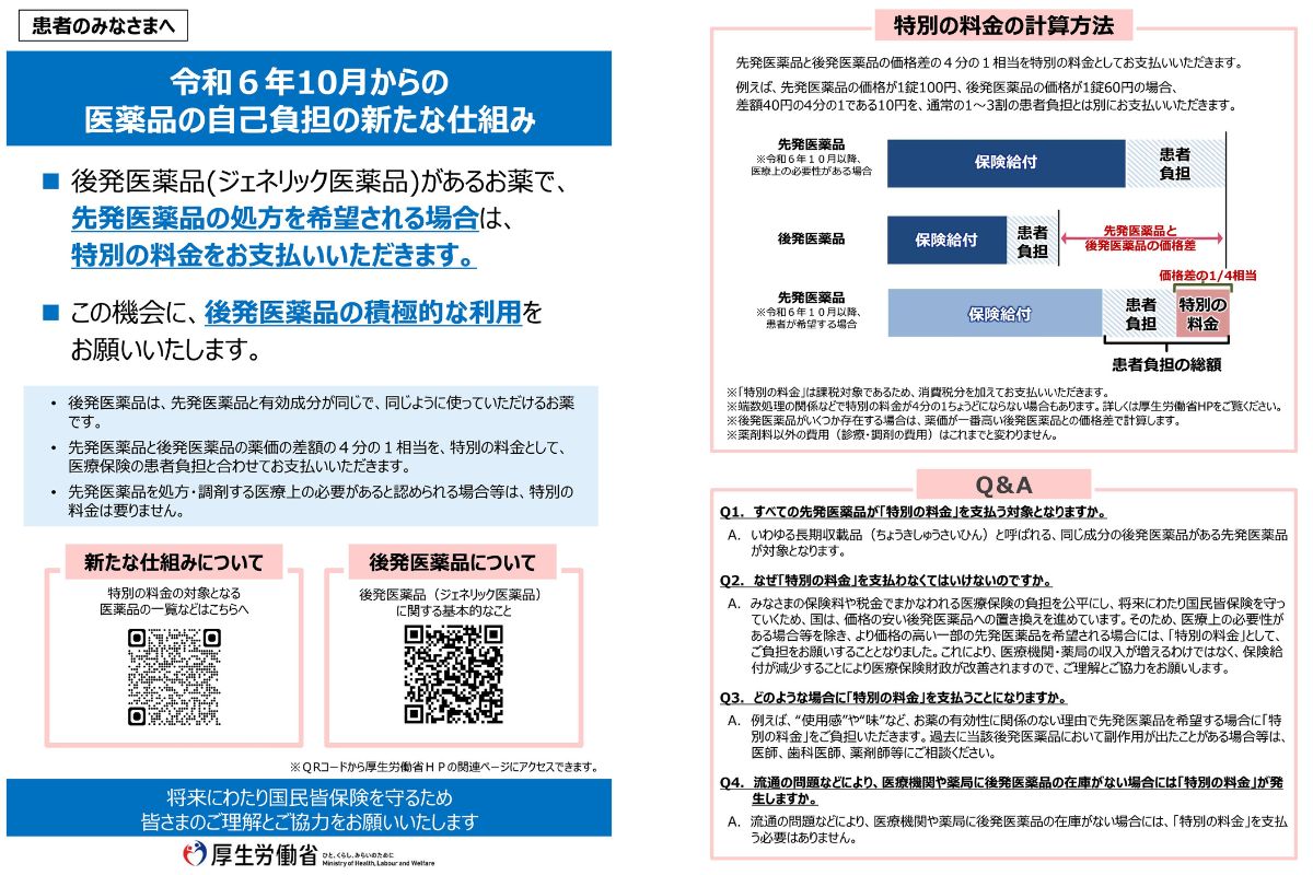令和6年10月より、後発医薬品(ジェネリック医薬品)があるお薬で、診療上医師の認める理由のないものの先発医薬品の処方を希望される場合は特別の料金をお支払いいただくこととなりました(長期収載品の処方における選定療養制度)。この機会に、後発医薬品の積極的な利用をお願いいたします。詳しくはこちらをご覧ください。
